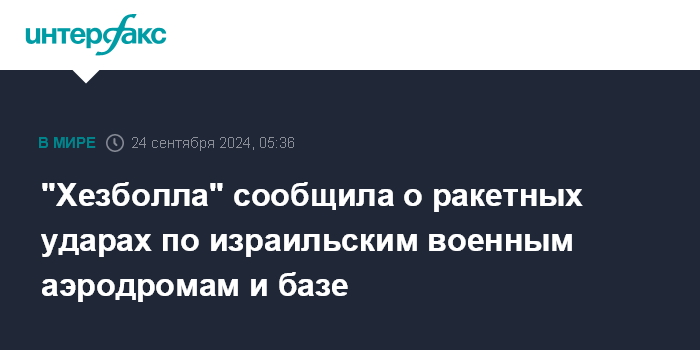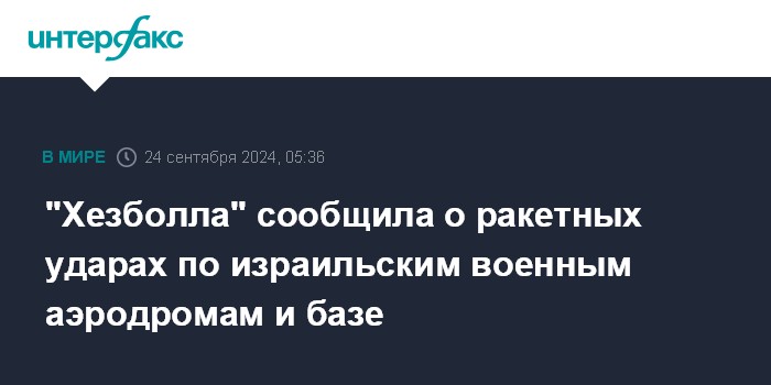 Москва. 24 сентября. INTERFAX.RU - Движение "Хезболла" в ночь на вторник нанесло удар тяжелыми ракетами по военному аэродрому в районе города Афула и авиабазе Рамат-Давид в Израиле, сообщает ливанский телеканал Аль-Манар со ссылкой на заявление группировки.