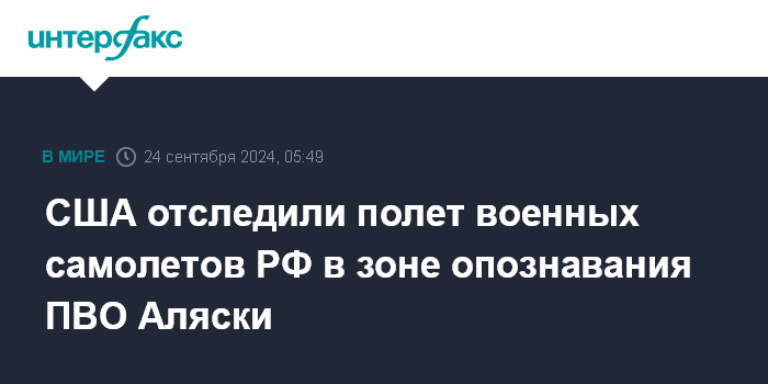 Москва. 24 сентября. INTERFAX.RU - Соединенные Штаты обнаружили и проследили за полетом "четырех российских военных самолетов в зоне опознавания ПВО Аляски (ADIZ)", сообщает Объединенное командование аэрокосмической обороны Северной Америки (NORAD).