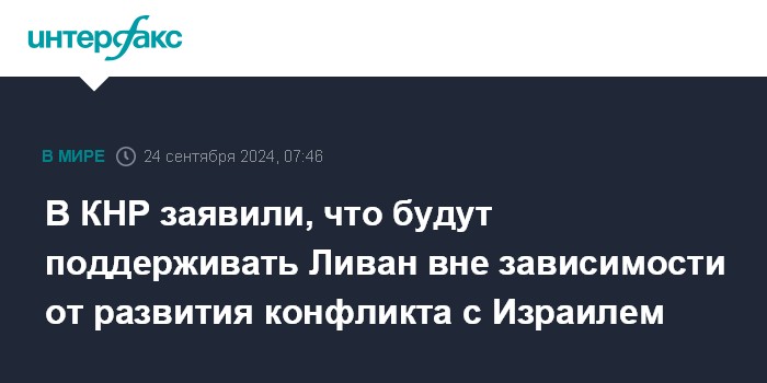 "Китай решительно поддерживает Ливан в деле защиты своего суверенитета, безопасности и национального достоинства. Независимо от того, как изменится ситуация, мы будем твердо стоять на стороне справедливости и наших арабских братьев, включая Ливан" - приводит китайский МИД слова Ван И на встрече с исполняющим обязанности главы МИД Ливана Абдаллой Бу Хабибом в кулуарах 79-й сессии Генассамблеи ООН.