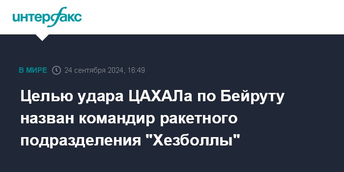 Москва. 24 сентября. INTERFAX.RU - Целью удара израильских военных по Бейруту был командующий ракетным подразделением движения "Хезболла", сообщает The Times of Israel со ссылкой на израильские военные источники.