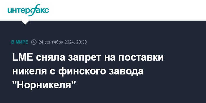 Москва. 24 сентября. INTERFAX.RU - Лондонская биржа металлов (LME) сняла запрет на поставки никелевых катодов и брикетов с финского рафинировочного завода "Норникеля" Norilsk Nickel Harjavalta, говорится в сообщении биржи.