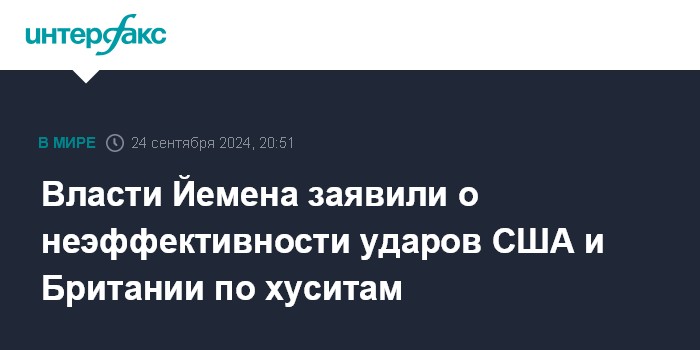 Москва. 24 сентября. INTERFAX.RU - Авиаудары США и Британии по хуситам не смогли всерьез навредить военному потенциалу йеменских мятежников, заявил вице-президент признанного в мире правительства Йемена генерал-майор Айдарус аз-Зубайди.