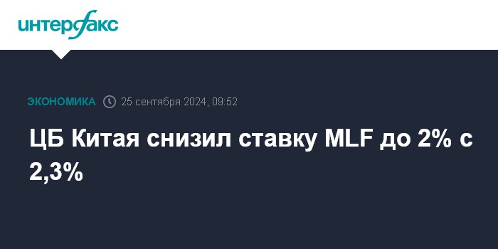 Москва. 25 сентября. INTERFAX.RU - Народный банк Китая (НБК, центробанк страны) в среду снизил ставку по кредитам сроком на год, выдаваемым по программе среднесрочного кредитования (MLF), до 2% с 2,3% годовых.