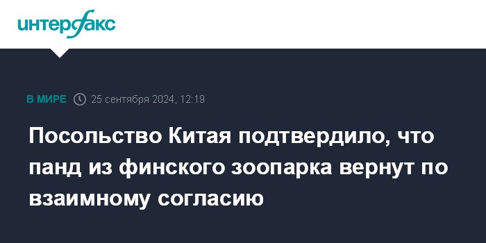 Москва. 25 сентября. INTERFAX.RU - Посольство Китая в Финляндии подтвердило, что возвращение панд из зоопарка Эхтяри пройдет по взаимному согласию. Об этом сообщили финские СМИ со ссылкой на ответ посольства Китая в Хельсинки.