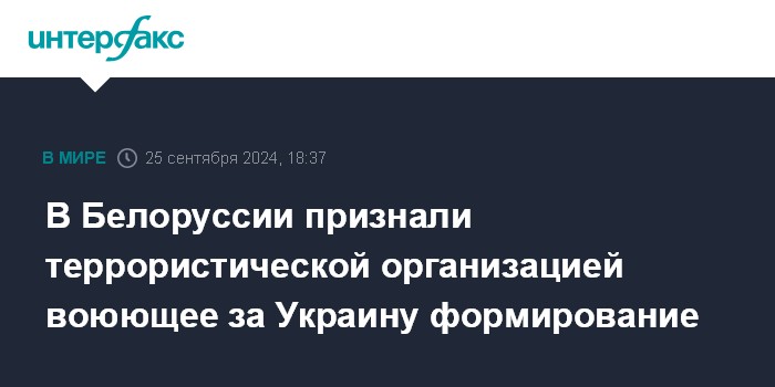 Москва. 25 сентября. INTERFAX.RU - Формирование белорусов "Полк имени Кастуся Калиновского", участвующее в конфликте на Украине на стороне Киева, признано в Белоруссии террористической организацией, сообщила в среду пресс-служба Генеральной прокуратуры республики.