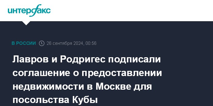 Москва. 26 сентября. INTERFAX.RU - Главы МИД РФ и Кубы Сергей Лавров и Бруно Родригес подписали межправительственное соглашение о предоставлении объектов недвижимости в Москве для размещения посольства Кубы в России.