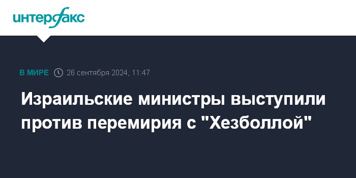 Москва. 26 сентября. INTERFAX.RU - Группа израильских министров призывает премьера Биньямина Нетаньяху отказаться от озвученной во время сессии Генассамблеи ООН идеи перемирия с "Хезболлой", сообщает в четверг The Times of Israel.