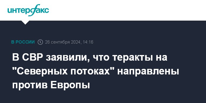 Москва. 26 сентября. INTERFAX.RU - Теракты на газопроводах "Северные потоки" были направлены против Европы, прежде всего, ФРГ, заявили в Службе внешней разведки России (СВР).
