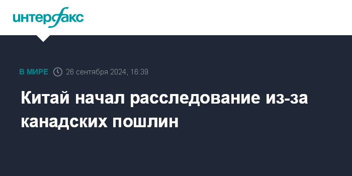 Москва. 26 сентября. INTERFAX.RU - Министерство торговли Китая начало расследование в связи с планируемым введением Канадой пошлин на импорт ряда китайских товаров в страну, сообщает агентство "Синьхуа".