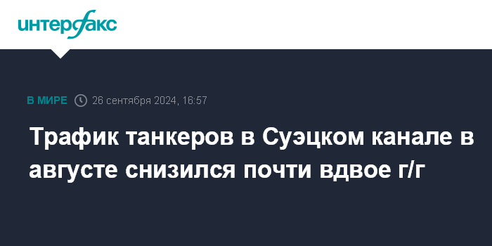Трафик танкеров в Суэцком канале в августе снизился почти вдвое г/г