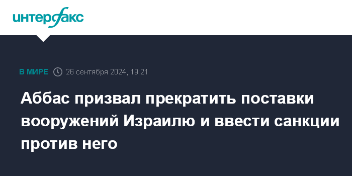 Москва. 26 сентября. INTERFAX.RU - Глава Палестинской национальной администрации (ПНА) Махмуд Аббас, выступая на Генассамблее ООН в четверг, призвал международное сообщество отказаться от поставок оружия Израилю и ввести против него санкции.