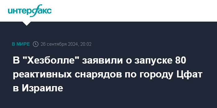 Москва. 26 сентября. INTERFAX.RU - Движение "Хезболла" сообщило в четверг, что в ответ на удары Израиля по Ливану его бойцы атаковали город Цфат на севере Израиля, сообщает издание The National.