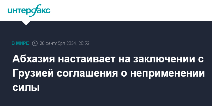 Москва. 26 сентября. INTERFAX.RU - МИД Абхазии призвал Грузию подписать соглашение о неприменении силы в ответ на выступление грузинского премьера Ираклия Кобахидзе на 79-й сессии Генассамблеи ООН, в котором тот высказался за объединение Абхазии и Южной Осетии с Грузией.