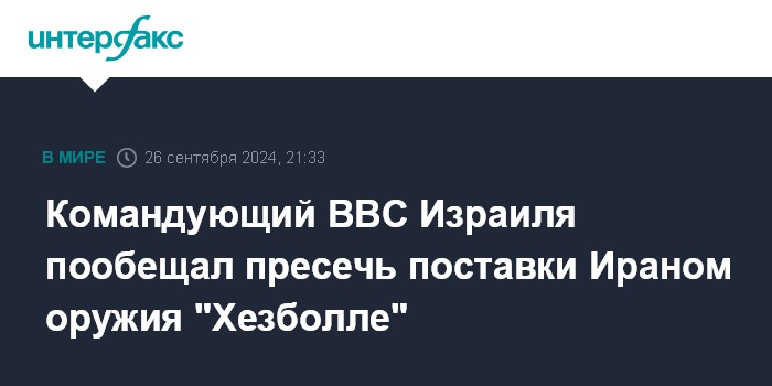 Москва. 26 сентября. INTERFAX.RU - Командующий ВВС Израиля генерал-майор Томер Бар в четверг заявил, что для вверенных ему войск основной задачей станет не позволить Ирану поставлять оружие ливанскому движению "Хезболла".