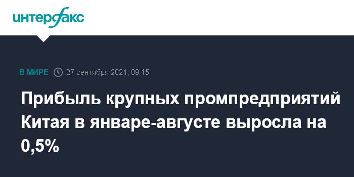 Прибыль крупных промпредприятий Китая в январе-августе выросла на 0,5%