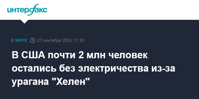 Москва. 27 сентября. INTERFAX.RU - Обрушившийся на штат Флорида ураган "Хелен" вызвал перебои в подаче электроэнергии, сообщает в пятницу CNN.