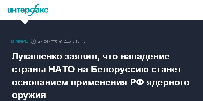 Москва. 27 сентября. INTERFAX.RU - Президент Белоруссии Александр Лукашенко заявил о готовности применить ядерное оружие в случае нападения со стороны стран НАТО и поблагодарил президента России Владимира Путина за внесение изменений в ядерную доктрину.
