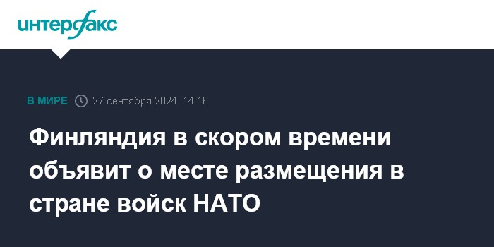 Москва. 27 сентября. INTERFAX.RU - Финляндия в скором времени объявит о месте дислокации передовых сухопутных войск НАТО (FLF) на территории страны, сообщил в пятницу финский министр обороны Антти Хяккянен.
