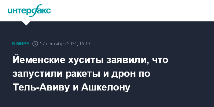 Москва. 27 сентября. INTERFAX.RU - Йеменские мятежники-хуситы запустили ракеты и беспилотник по военным целям в израильских городах Тель-Авив и Ашкелон, сообщил представитель хуситов генерал Яхья Сари в пятницу.