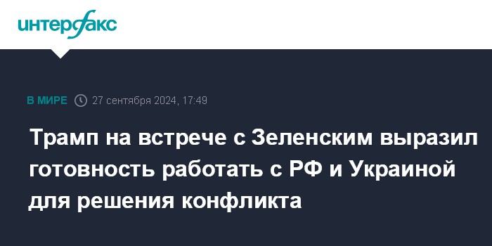 Москва. 27 сентября. INTERFAX.RU - Экс-президент США Дональд Трамп на встрече с украинским лидером Владимиром Зеленским пообещал в случае избрания главой государства сотрудничать и с Киевом, и с Москвой для нормализации обстановки на Украине.