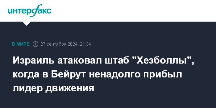 Москва. 27 сентября. INTERFAX.RU - Израильские военные нанесли удар по штаб-квартире "Хезболлы" в Бейруте в тот момент, когда лидер движения Хасан Насралла со своим окружением приехал с кратким визитом в ливанскую столицу, сообщает ABC со ссылкой на неназваного представителя властей США.