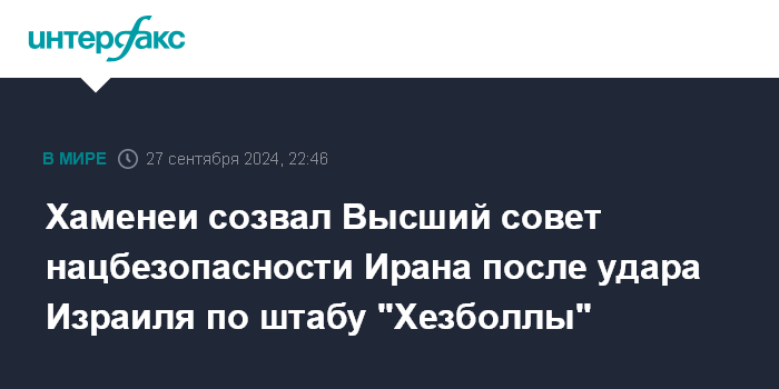 Москва. 27 сентября. INTERFAX.RU - Верховный лидер Ирана аятолла Али Хаменеи созвал чрезвычайное заседание Высшего совета национальной безопасности в связи с ударом Израиля по штаб-квартире движения "Хезболла" в Бейруте, сообщает The New York Times со ссылкой на двух представителей иранских властей.