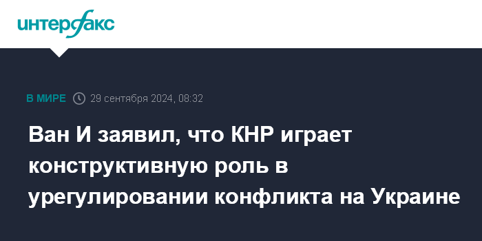 Москва. 29 сентября. INTERFAX.RU - Министр иностранных дел КНР Ван И заявил, что Китай в урегулировании украинского кризиса играет конструктивную роль, убеждает заинтересованные стороны решить проблемы мирным путем.