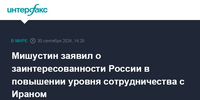Москва. 30 сентября. INTERFAX.RU - Россия заинтересована в том, чтобы вывести сотрудничество с Ираном на более высокий уровень, заявил на переговорах с первым вице-президентом Ирана Мохаммадом Резой Арефом премьер-министр России Михаил Мишустин.