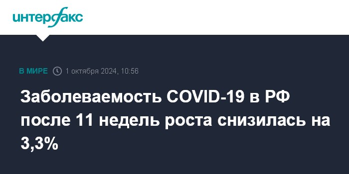 Заболеваемость COVID-19 в РФ после 11 недель роста снизилась на 3,3%