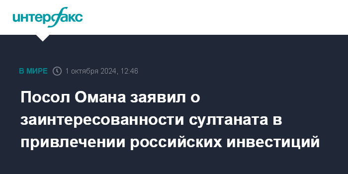 Москва. 1 октября. INTERFAX.RU - Оман заинтересован в привлечении российских инвестиций, ведёт работу над облегчением условий для работы иностранного бизнеса, заявил посол султаната в России Хамуд Салим Абдулла Аль Тувайх.