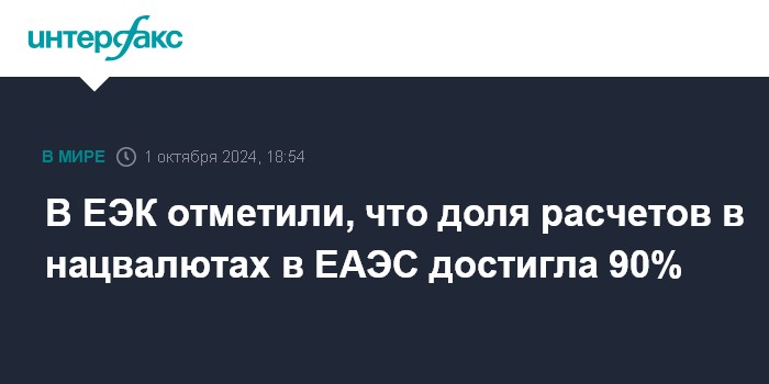 Москва. 1 октября. INTERFAX.RU - Доля расчетов в национальных валютах в Евразийском экономическом союзе по итогам 2023 года достигла 90%, заявил во вторник журналистам председатель коллегии Евразийской экономической комиссии Бакытжан Сагинтаев.