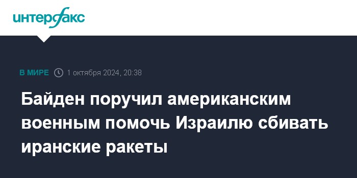 Москва. 1 октября. INTERFAX.RU - Президент США Джо Байден поручил американским военным помочь Израилю на фоне запущенных из Ирана ракет. Об этом сообщают во вторник американские СМИ со ссылкой на Белый дом.