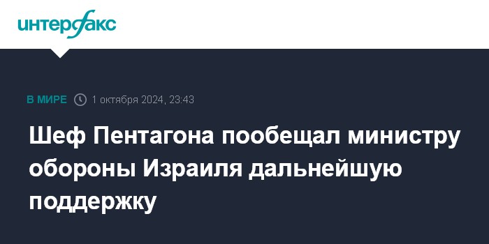 Москва. 1 октября. INTERFAX.RU - Шеф Пентагона Ллойд Остин в ходе второго за вторник телефонного разговора с министром обороны Израиля Йоавом Галантом заявил, что США готовы и дальше помогать Израилю в сфере обороны, сообщил во вторник представитель Пентагона Пэт Райдер.