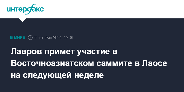 Москва. 2 октября. INTERFAX.RU - Глава МИД России Сергей Лавров посетит Лаос 11 октября для участия в Восточноазиатском саммите (ВАС), сообщила официальный представитель МИД РФ Мария Захарова.