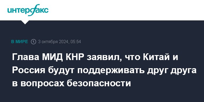 Москва. 3 октября. INTERFAX.RU - Китай и Россия будут реализовывать достигнутый главами государств консенсус о взаимной поддержке в вопросах обеспечения безопасности и суверенитета, заявил министр иностранных дел КНР Ван И.