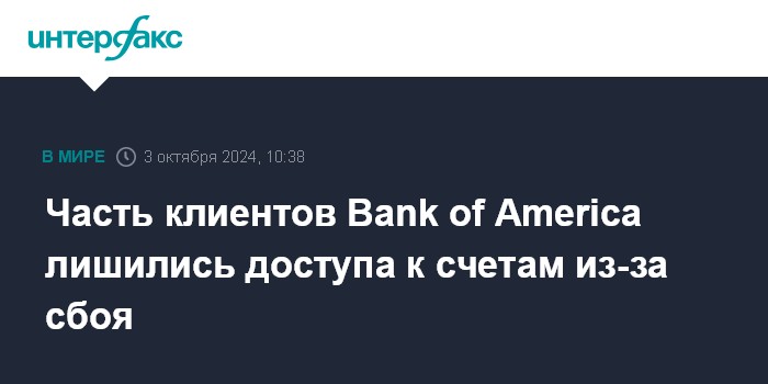Москва. 3 октября. INTERFAX.RU - Сбой в работе Bank of America Corp. привел к тому, что ряд клиентов банка не могли получить доступ к счетам. Другие клиенты, судя по сообщениям в соцсетях, видели ошибочную сумму в ноль долларов на балансе, пишет MarketWatch.