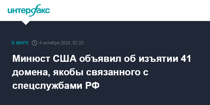Москва. 4 октября. INTERFAX.RU - Американское министерство юстиции объявило о выдаче ордера на изъятие 41 домена, якобы используемого "агентами российских спецслужб и их доверенными лицами для совершения киберпреступлений в США".