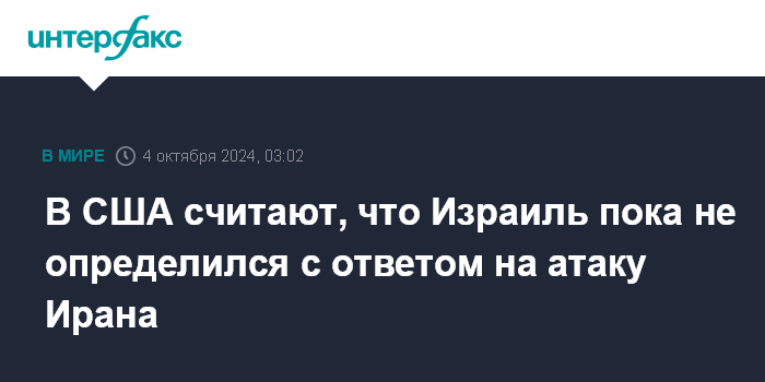 Москва. 4 октября. INTERFAX.RU - США считают, что Израиль пока не принял решение о том, как ответить на атаку Ирана, сообщает CNN со ссылкой на американского чиновника.