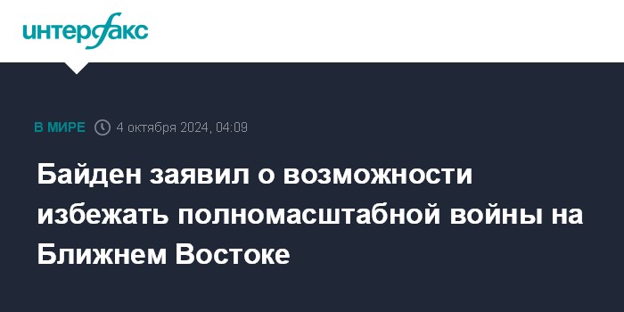 Москва. 4 октября. INTERFAX.RU - Президент США Джо Байден заявил, что, по его мнению, есть возможность избежать полномасштабной войны на Ближнем Востоке.
