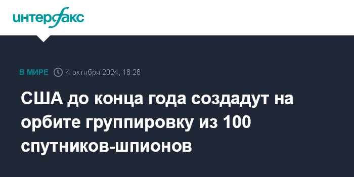 Москва. 4 октября. INTERFAX.RU - Национальное управление военно-космической разведки США (NRO) планирует до конца года развернуть на орбите группировку из сотни разведывательных спутников, сообщил директор управления Кристофер Сколезе.