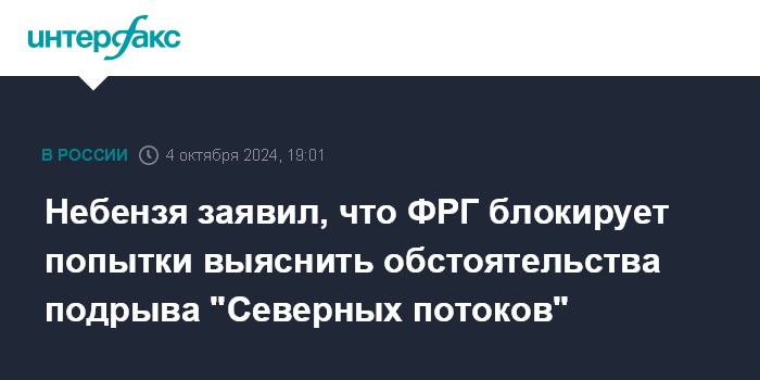 Москва. 4 октября. INTERFAX.RU - Немецкая сторона мешает попыткам установить все обстоятельства подрывов "Северного потока" и "Северного потока 2", заявил постпред РФ при ООН Василий Небензя.