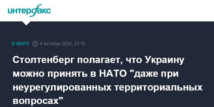Москва. 4 октября. INTERFAX.RU - Члены НАТО могут принять Украину в альянс даже при наличии у нее "нерешенных территориальных споров", в таком случае гарантии безопасности альянса даются только на территорию, контролируемую Киевом, предположил бывший генсек Североатлантического альянса Йенс Столтенберг в опубликованном в пятницу интервью Financial Times.