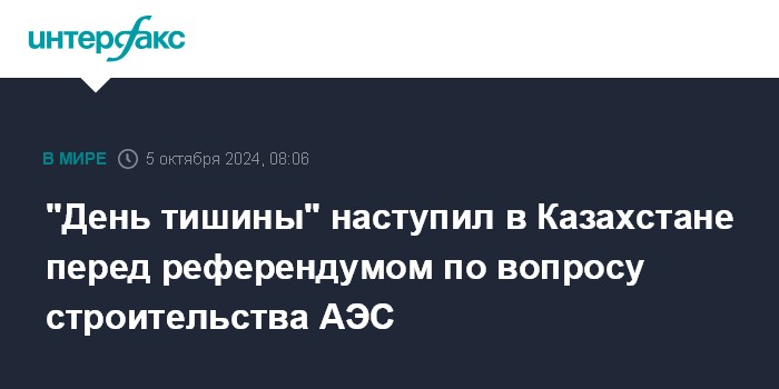 Москва. 5 октября. INTERFAX.RU - В Казахстане в субботу наступил "день тишины" перед днем голосования на республиканском референдуме по вопросу строительства АЭС.