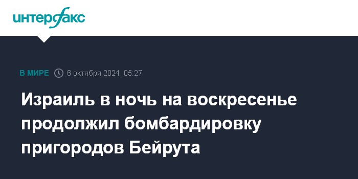 Москва. 6 октября. INTERFAX.RU - Самолеты ВВС Израиля в ночь на воскресенье нанесли серию ударов по южным пригородам Бейрута, сообщают арабские СМИ.