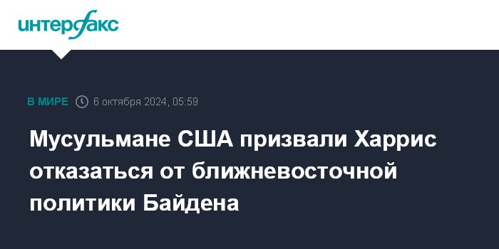 Москва. 6 октября. INTERFAX.RU - Лидеры мусульманской и арабской общин Америки на встрече в Мичигане с вице-президентом США и кандидатом на пост главы государства от демократов Камалой Харрис потребовали от нее отойти от той политики, которую в отношении Ближнего Востока проводит президент Джо Байден, сообщил CNN.