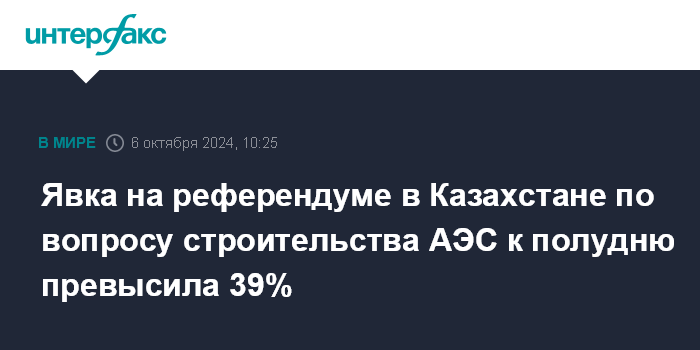 Москва. 6 октября. INTERFAX.RU - В Казахстане по состоянию на 12:00 воскресенья явка граждан на референдум по вопросу строительства атомной электростанции (АЭС) составила 39,23% от списочного состава, сообщил член Центризбиркома Шавкат Утемисов.