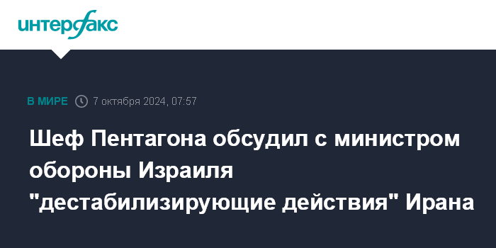 Москва. 7 октября. INTERFAX.RU - Министр обороны США Ллойд Остин обсудил с израильским коллегой Йоавом Галантом "дестабилизирующие действия" Ирана на Ближнем Востоке и текущую ситуацию в Ливане и секторе Газа, сообщает Пентагон.