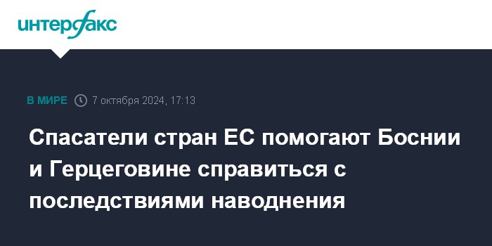 Москва. 7 октября. INTERFAX.RU - Еврокомиссия (ЕК) объявила в понедельник об отправке поисково-спасательных групп для поддержки Боснии и Герцеговины (БиГ) в связи с сильным наводнением.