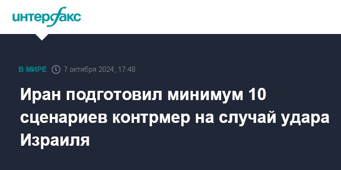 Москва. 7 октября. INTERFAX.RU - Командование Вооруженных сил Ирана разработало как минимум десять сценариев, по одному из которых иранские военные будут действовать в случае удара Израиля, сообщает в понедельник агентство "Тасним" со ссылкой на источник.