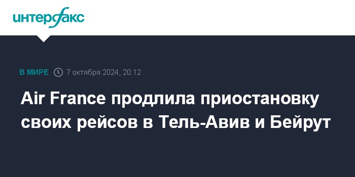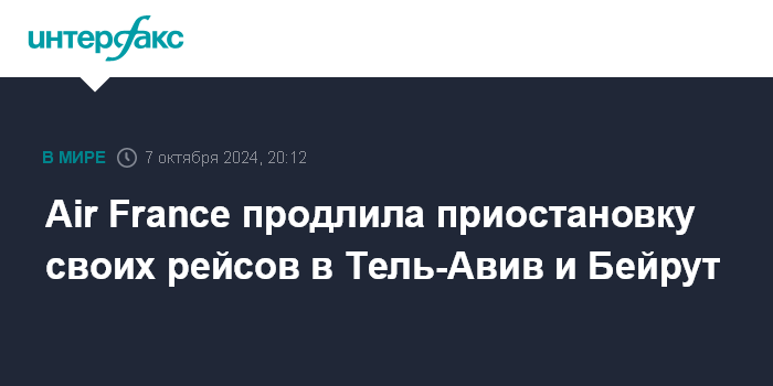 Air France объявила, что она продлевает приостановку своих рейсов между Парижем и Тель-Авивом до 15 октября, сообщили СМИ Франции со ссылкой на официального представителя компании.